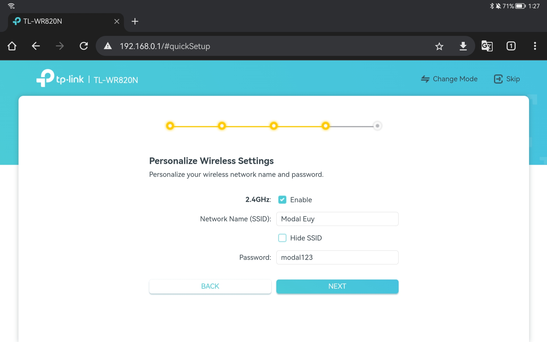1. Sebelum mulai konfigurasi, pastikan kabel dari sumber internet sudah terhung ke port WAN TP-Link ya. Hubungkan hp dengan SSID Access Point, nama SSID dan Password bisa dilihat di bagian bawah perangkat TP-Link TL-WR820N.