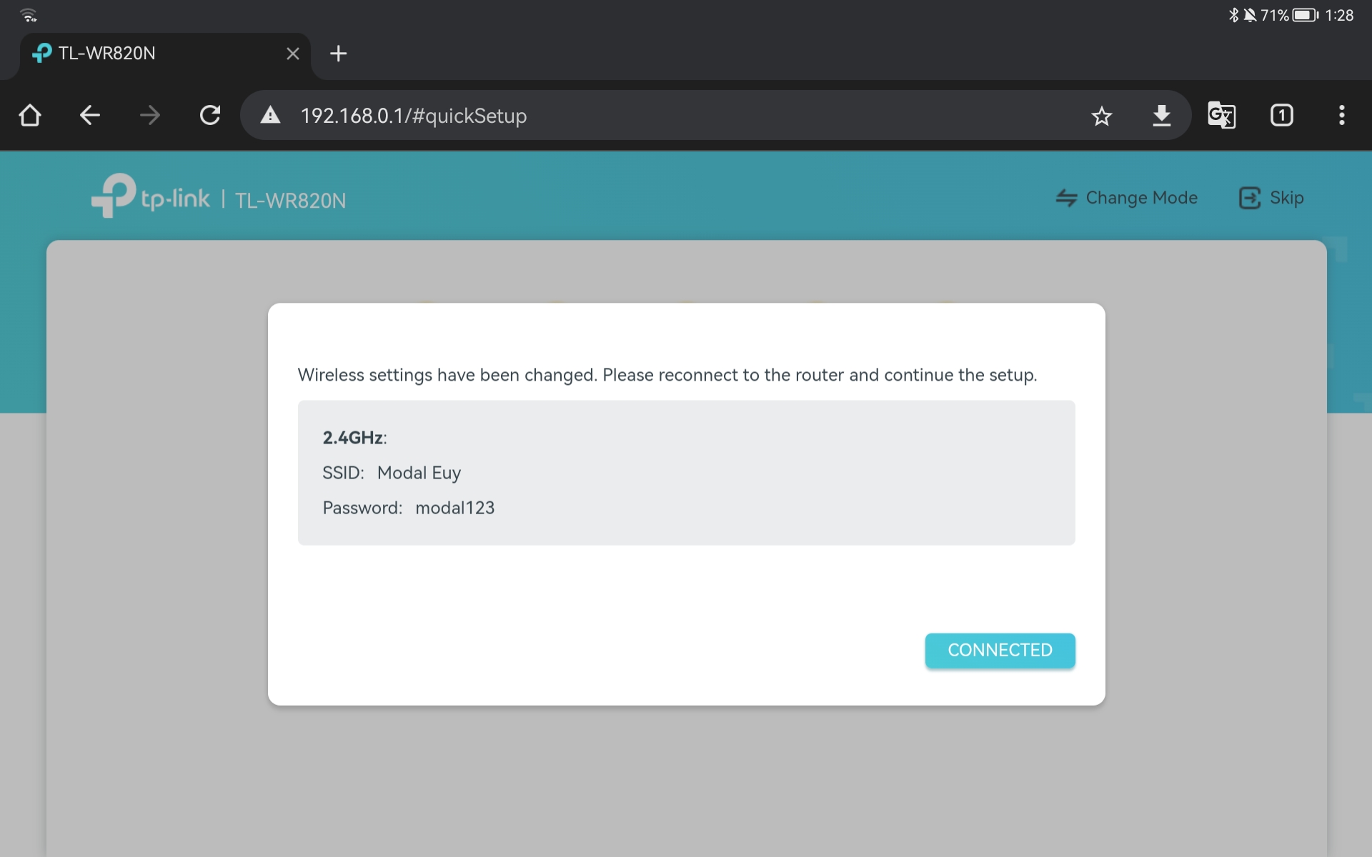8. Selanjutnya TP-Link akan merestart secara otomatis. Hubungkan kembali hp dengan SSID dan passwrd yang baru.