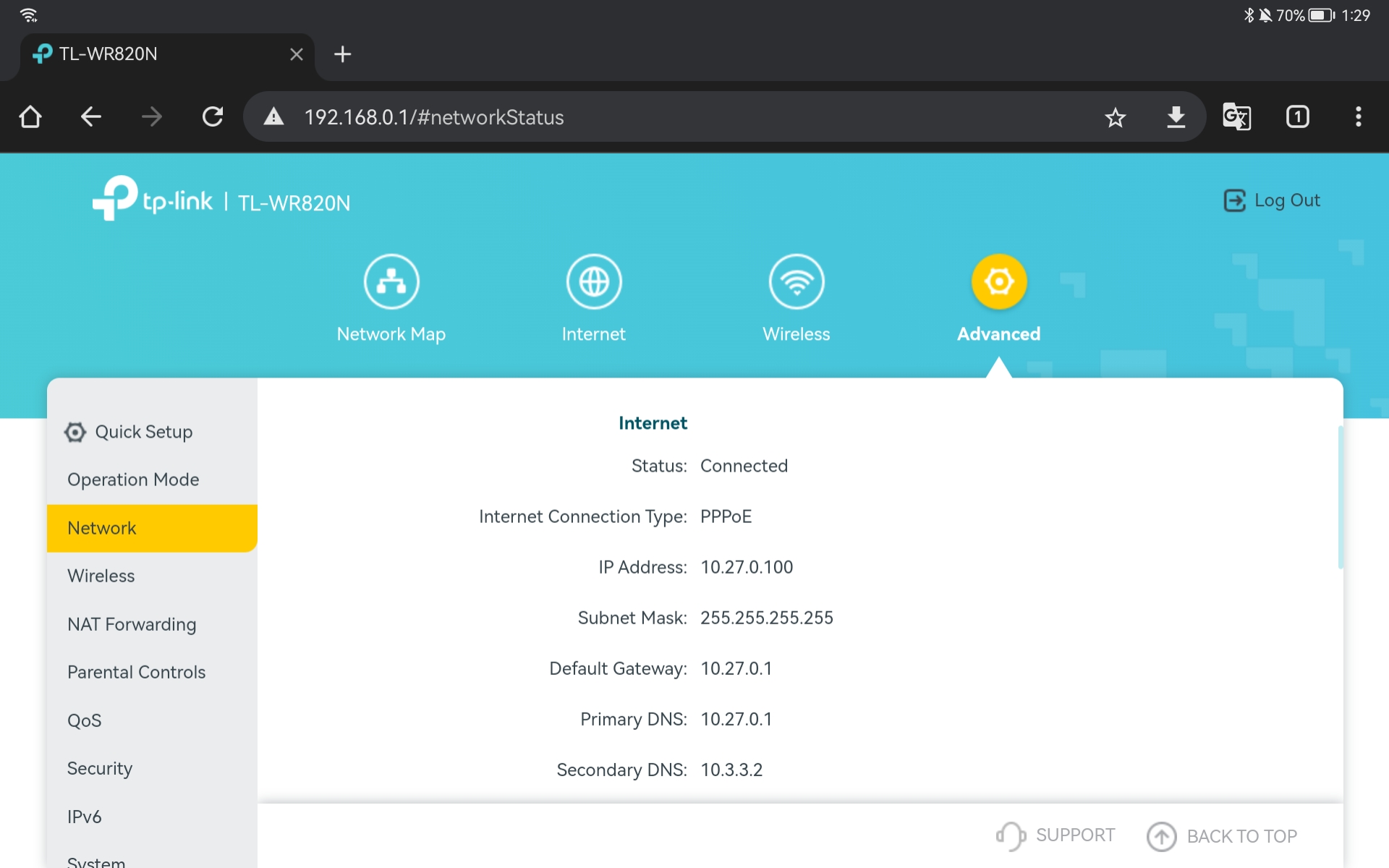 10. Bisa juga dengan masuk ke menu Advance > Network. Status sudah connected dengan internet dan muncul detail alamat IP PPPoE Client.