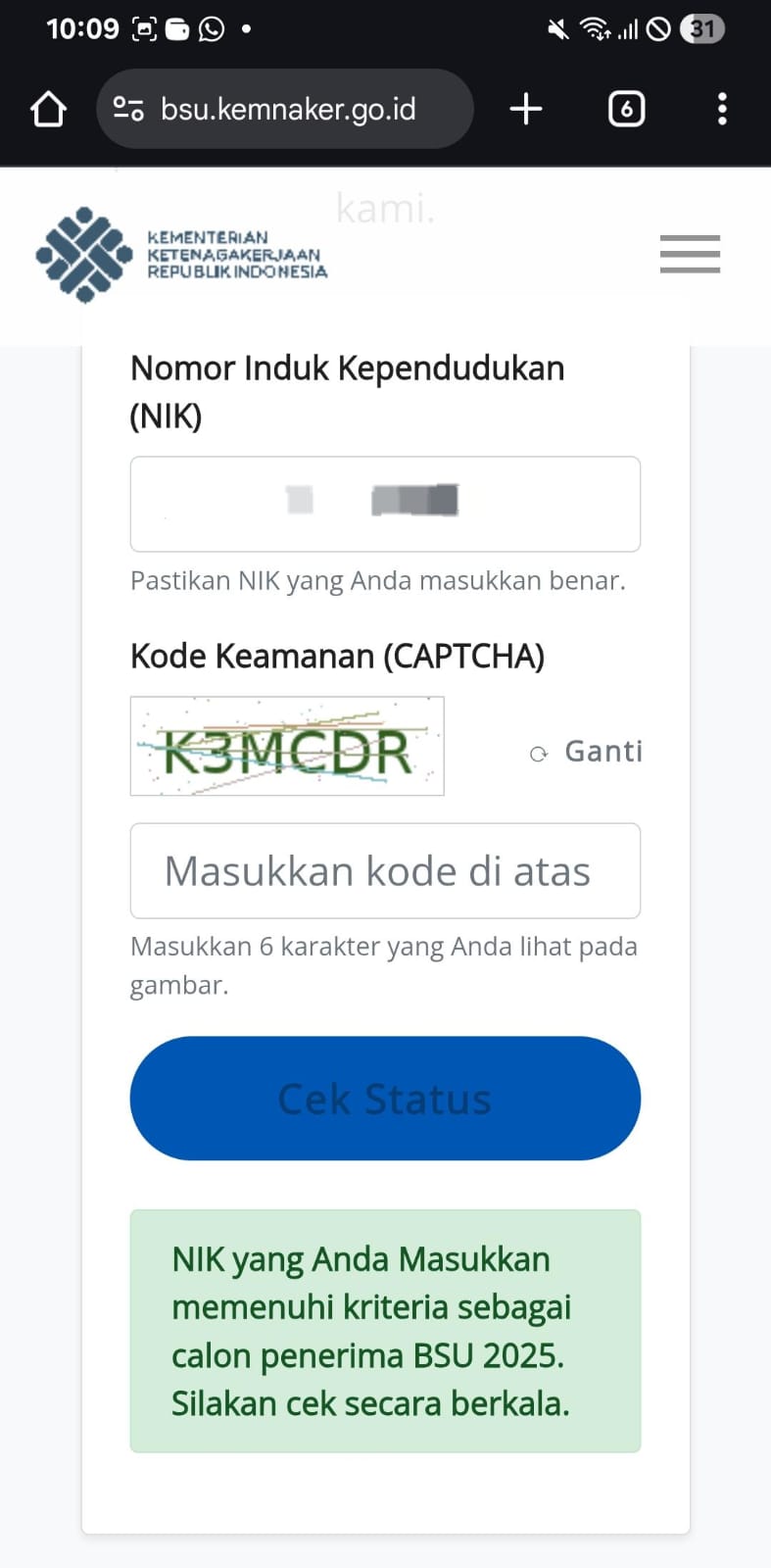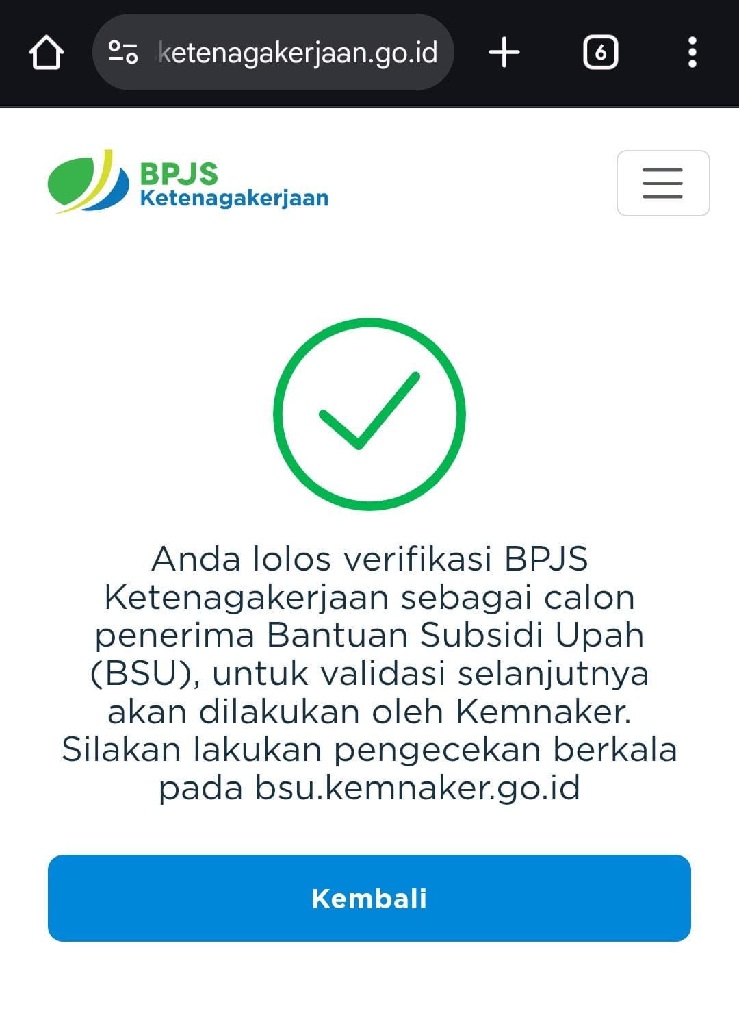 Kita juga bisa melakukan pengecekan di website bsu.kemnaker.go.id.